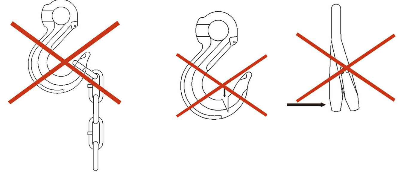 1.使用吊钩时,应将索具顶端部件挂入吊钩受力中心位置,不能直接挂入吊钩钩尖部位,如图: