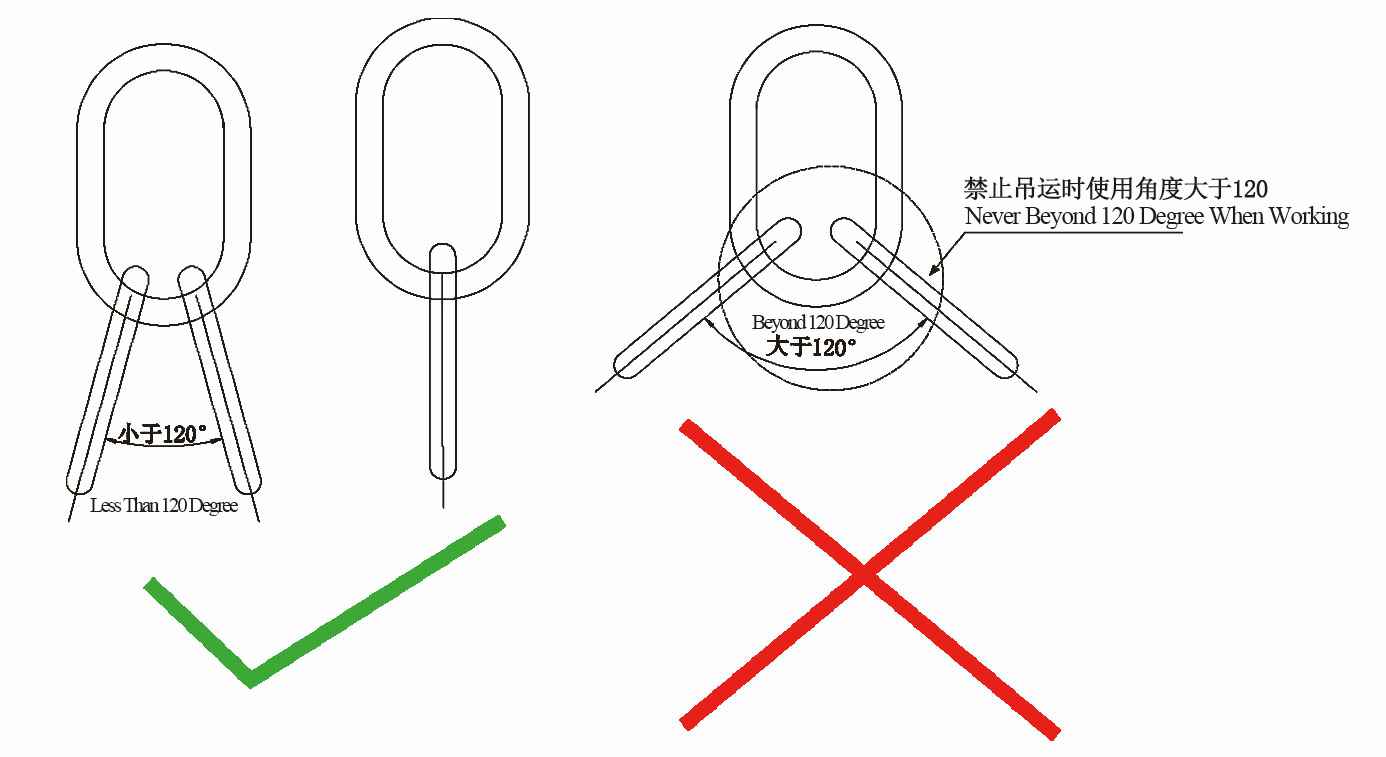 1、使用多肢链条索具起吊时,链条夹角一般应不超过90度,最大不得超过120度。