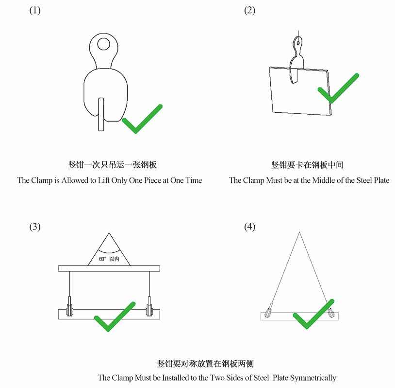 2.根据钢板的重量和厚度选择合适的竖钳,严禁超载使用。