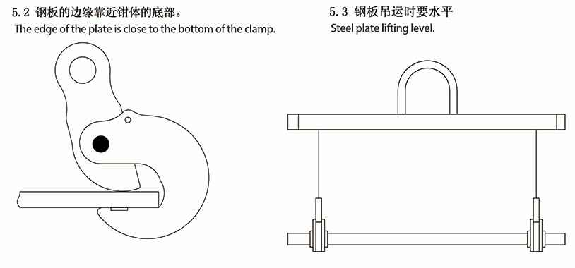 2.此吊钳仅适用于钢板的竖直吊装,严禁用于钢板的水平吊装。