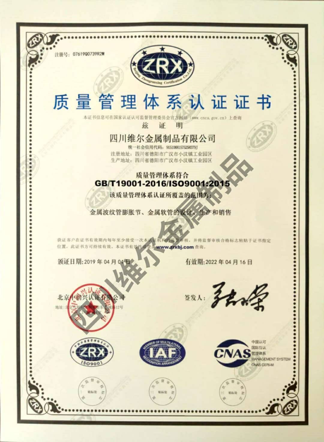 质量管理体系认证证书